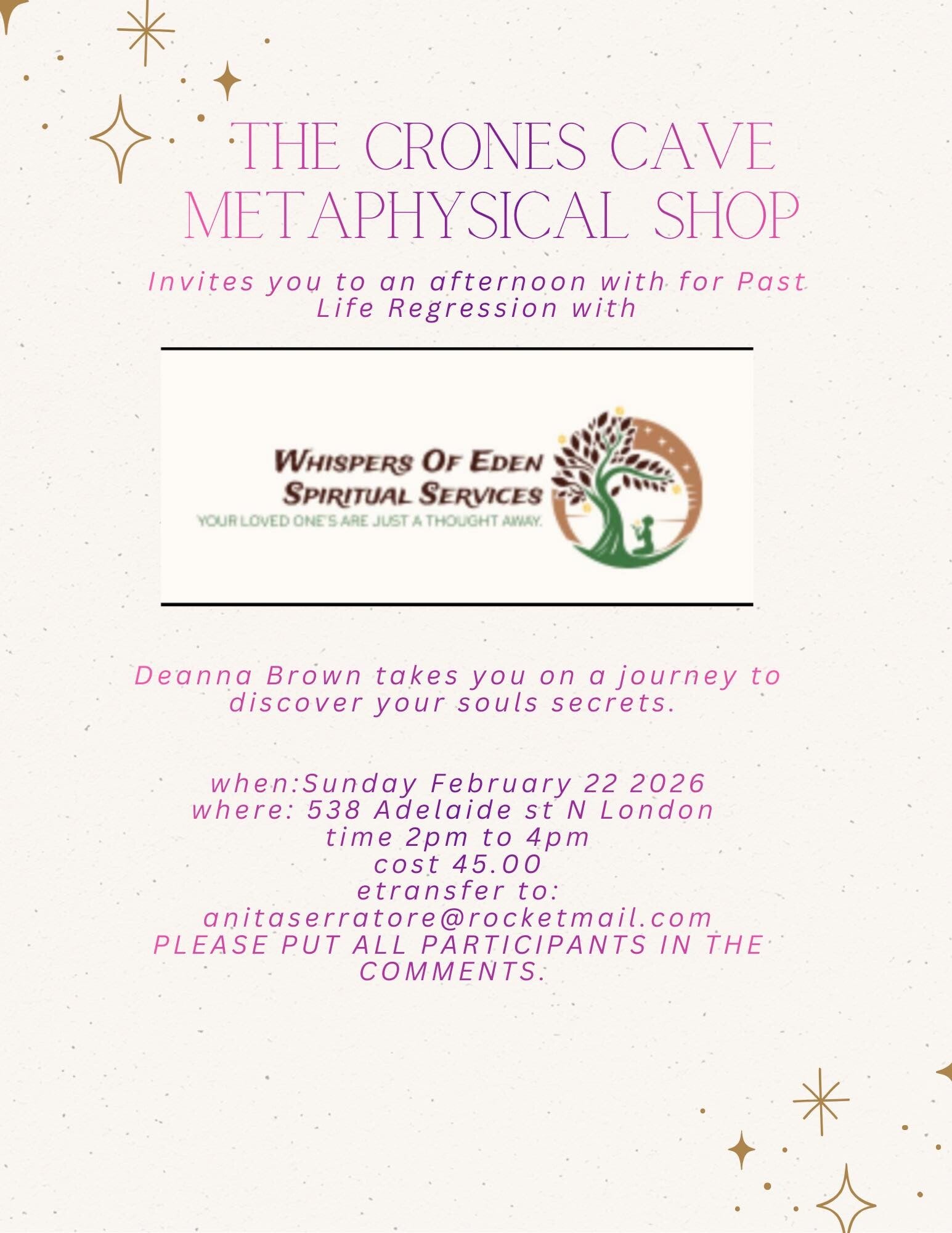 Interested in attending one of our magical events? To secure your spot, please etransfer the required fee to anitaserratore@rocketmail.com. In the comment section, be sure to include your name so we know who will be joining us! We look forward to welcoming you into our circle.